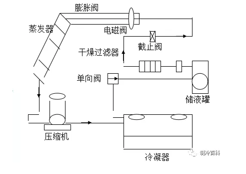 工作时压缩机吸入制冷剂蒸汽、压缩成高压高温的蒸汽后排入冷凝器、在冷凝器中向冷却介质(水或空气)放热,冷凝为高压液体、经节流阀节流为低压低温的制冷剂、再次进入蒸发器吸热汽化,达到循环制冷的目的。